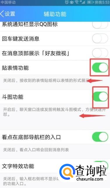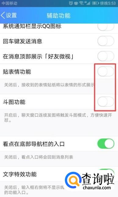 弹出的界面,我们将贴表情功能和斗图功能的开关按钮全部向左滑动;
