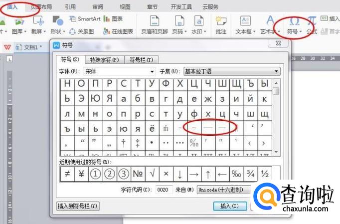 在Word2010中,点击 “插入”符号→ ”特殊符号“ ,就可以看到第一个符号就是长划线“—”