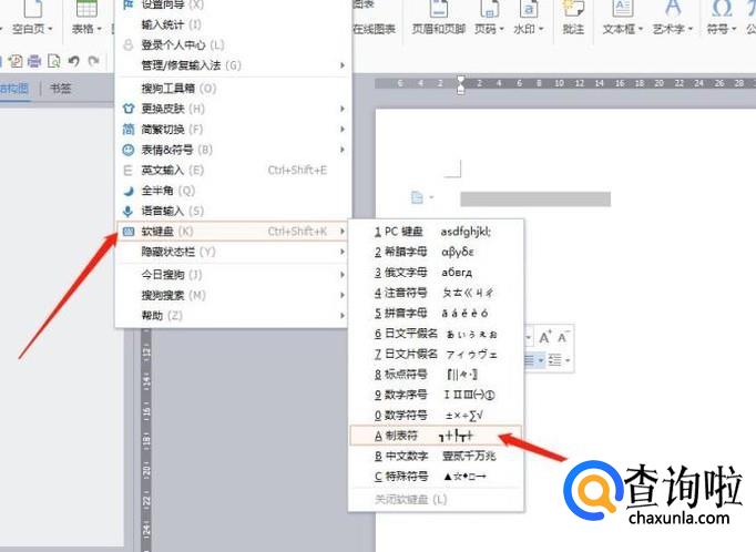 先调出搜狗输入法--------再右键点击-------找到软键盘-------制表符