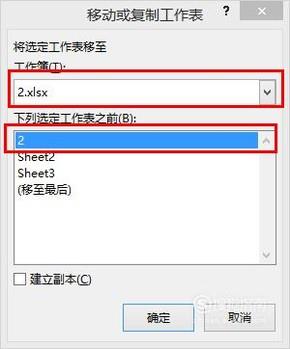 弹出的界面中,“工作簿”选择“2.xlsx”,“下列选定工作表之前”选择默认“2”.点击确定。