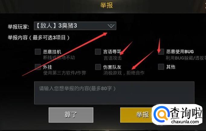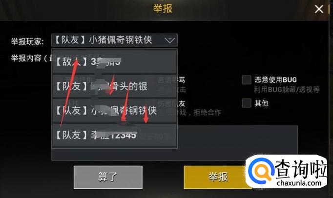 无论是队友还是敌人,你选择一个,然后选择你要举报的内容,然后在下面的黄色举报按钮直接举报就可以了。