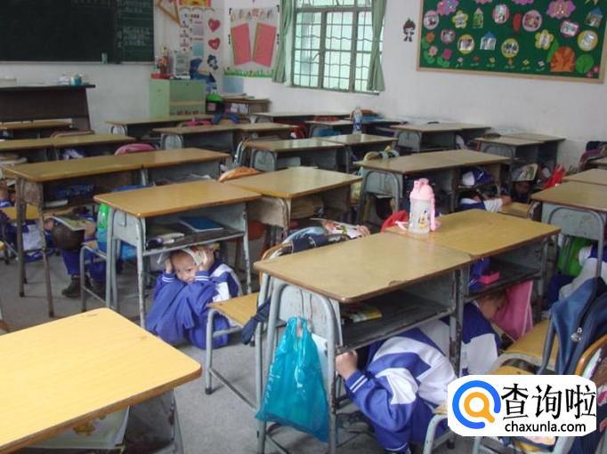 在学校听从老师的指挥,躲在桌子旁,同样需要抱头,护住最脆弱的地方。