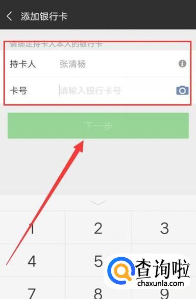 进入之后,将银行卡号和姓名输入到图示位置,然后点击“下一步”,如图所示。