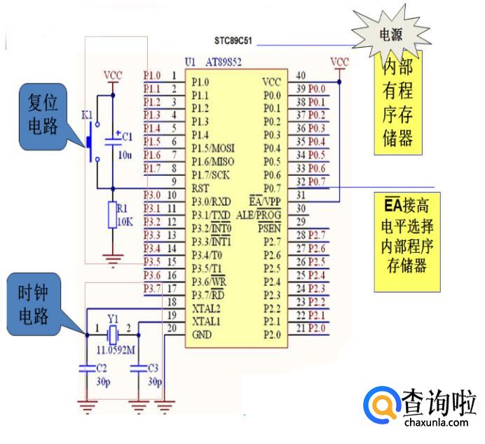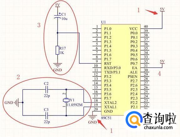 下图是最小系统原理图,就是靠这四个部分,单片机就可以运行起来了。第一部分电源组,习惯说负极为”地”,上面GND就是英文ground的缩写。第二部分晶振组,过滤掉晶振部分的高频信号,让晶振工作的时候更加稳定。