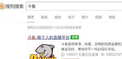 打开搜狗浏览器,在搜索框中输入“斗鱼”,点击蓝色字体“官网”的链接。
