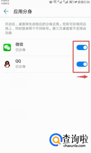弹出的界面,我们将微信和QQ的分身按钮朝着右边滑动打开就可以了,之后我们就可以登录两个微信和QQ了。