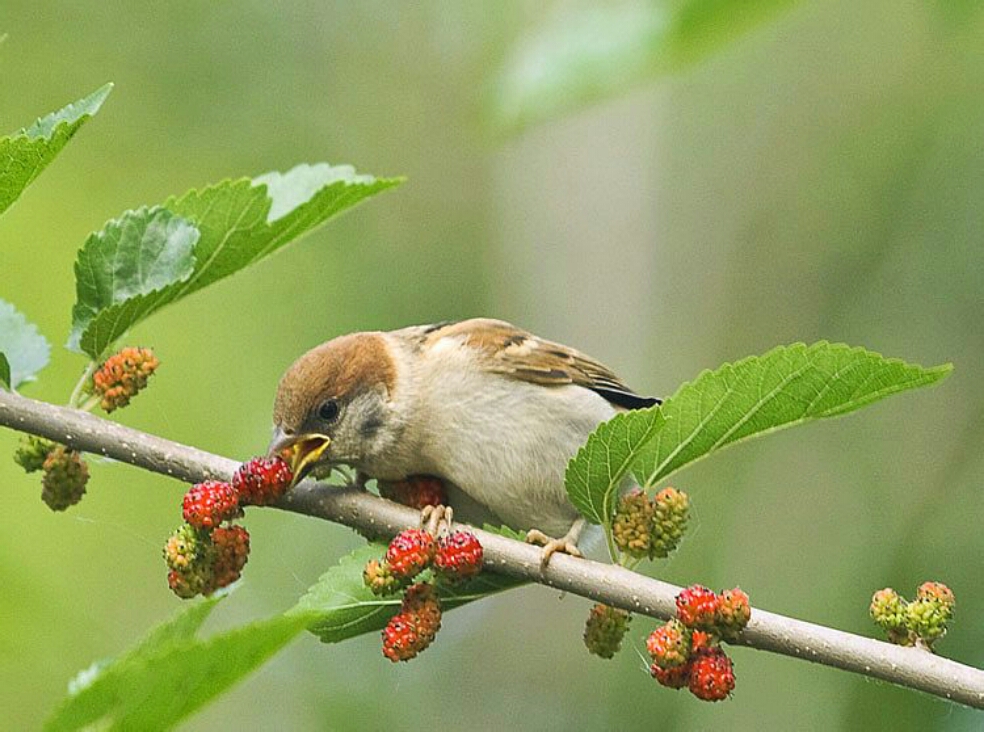 麻雀是杂食性鸟类,冬季和早春以杂草种子和野生禾本科植物的种子为食,也吃人类扔弃的各种食物,育雏则主要以为害禾本科植物的昆虫为主,其中多为鳞翅目害虫。
