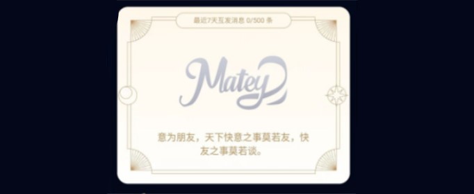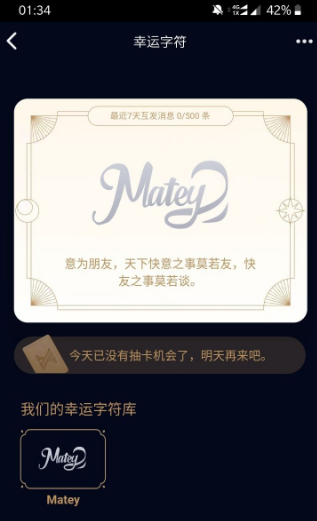 matey标识是QQ互动标识的幸运字符,意为“朋友,天下快意之事莫若友,快友之事莫若谈。”只要您与好友七天内每发100条消息就可以解锁一个字母,总共五个字母,因此需与好友在七天内互发500条消息即可解锁整个字符。