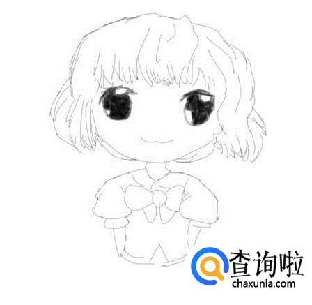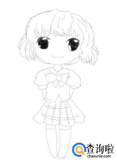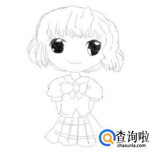 再在身体下面画出Q版妹子穿的裙子及裙褶,如图所示: