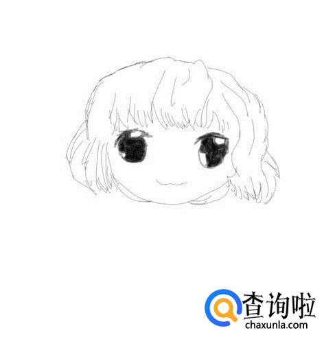 再在头发的下面画出Q版妹子的眉毛,然后再画出Q版妹子的眼睛和嘴巴,并在画出Q版妹子的面部,如图所示: