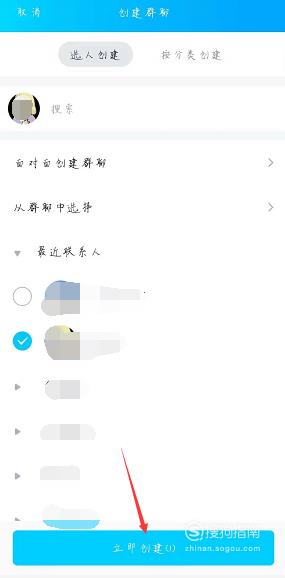 在新界面里选择“选人创建”,然后选择想要加入群聊的好友,选好后点击下面的“立即创建”,如下图所示。