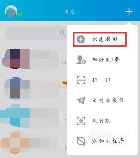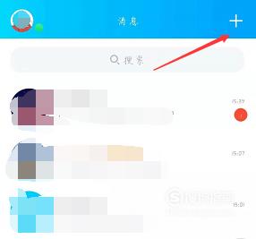进入手机QQ,点击消息页面右上角的“+”标志,如下图所示。