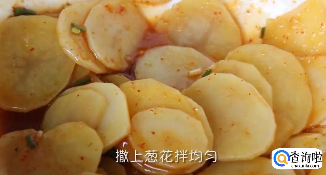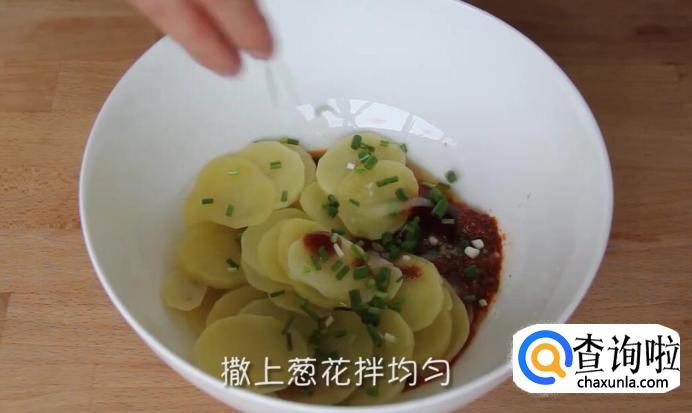 将沥干水的土豆放入盘中调味。依次放入辣椒酱20克、醋5克、芝麻油10克、花椒油3克、蚝油10克、盐适量、蒜水适量、橄榄油20克,最后撒上葱花拌均匀。