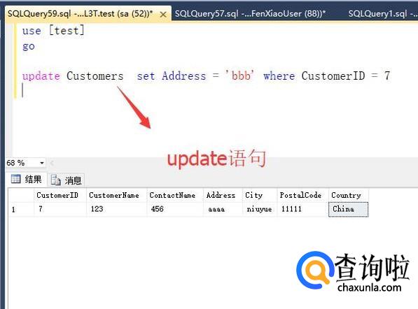然后是update语句,update是进行数据更新的语句,更新的时候一定要指定where条件,如下图所示
