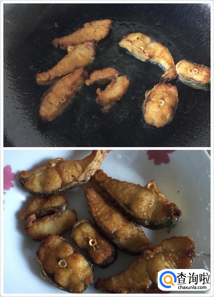 然后,将鱼块放入油锅中煎至两面金黄,放入姜蒜和盐。