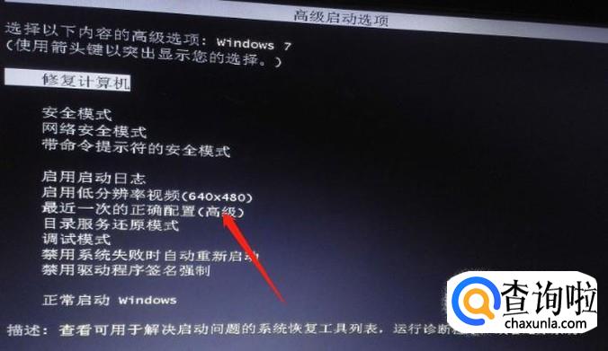 当屏幕出现“高级选项”时才松手,然后按键盘上的上下键,选择“最近一次的正确配置”,然后点回车键,电脑就修复好了。