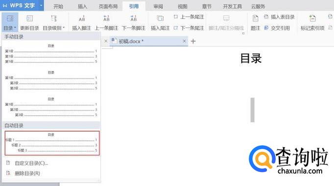 点击“目录”,这里选择“自动生成目录”。
