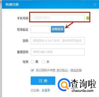 接着输入你的手机号码并点击获取短信,如下图所示。