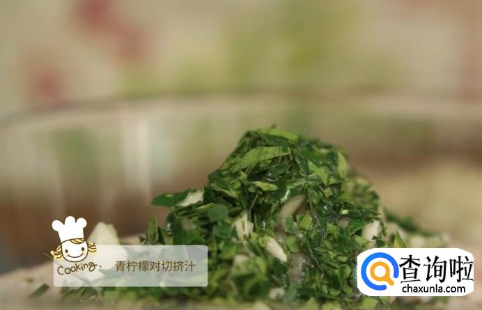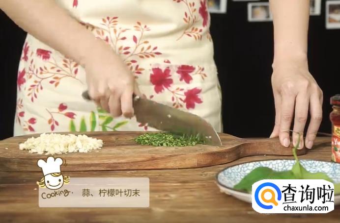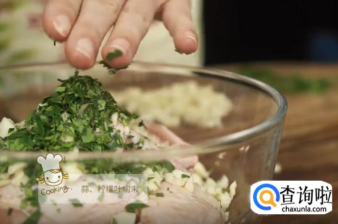 将蒜和柠檬叶都切成末状,放入盛鸡翅的碗中。