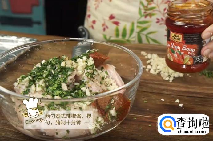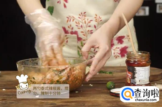 接着,在碗里加入两勺泰式辣椒酱,然后戴上手套将鸡翅和所有调料搅拌均匀,放在一旁腌制10分钟左右。