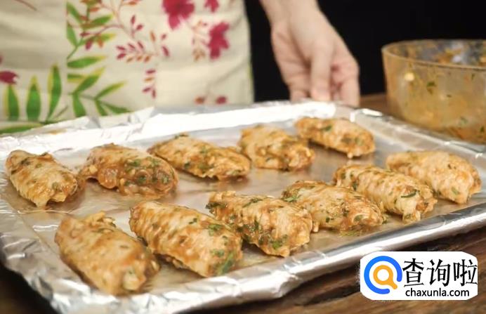 在烤盘上铺好锡箔纸,将腌制好的鸡翅放进去,注意需要摆放得有一点距离,不要挨得太近。