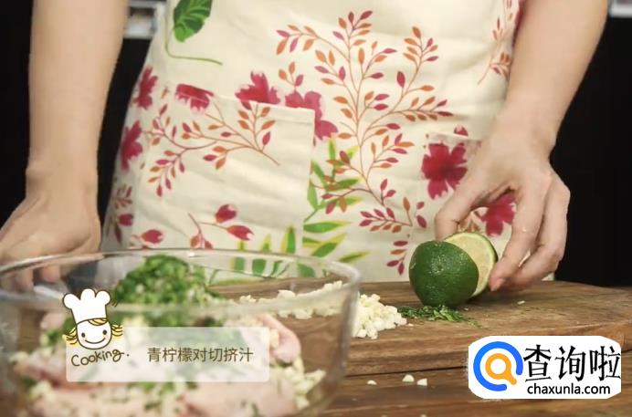 把青柠檬对半切开,将其汁液挤入盛鸡翅的碗中。
