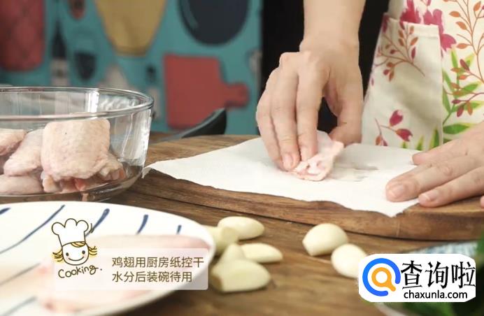 用厨房纸将准备好的鸡翅中的水分吸干,然后装进碗里备用。