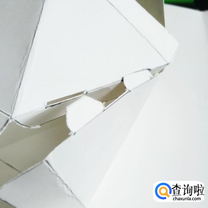 把三角形左边的两处地方,用刻刀刻一下,再把右边突出的地方对折进去。
