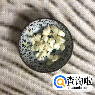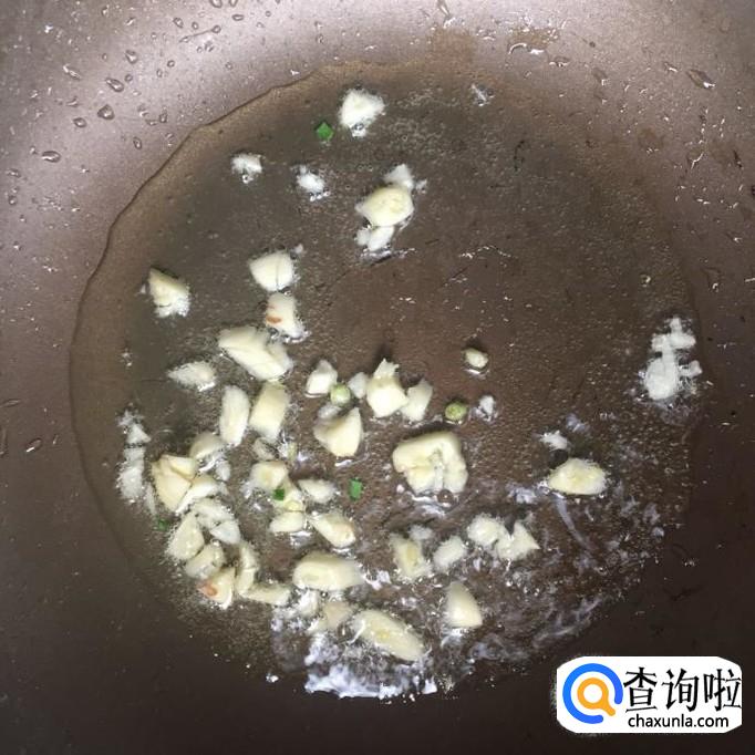 接着将蒜头切成蒜蓉,锅中加入适量的食用油。待油冒烟,倒入蒜蓉爆香。