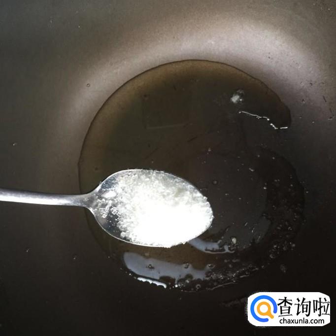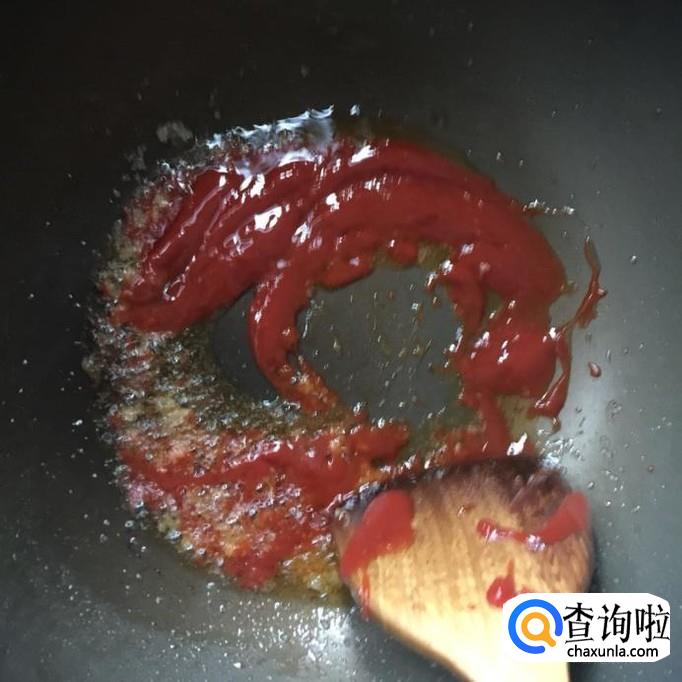 接着往锅中加入适量的食用油,待油冒烟,加入适量的白砂糖,熬至金黄色,加入适量的番茄酱。
