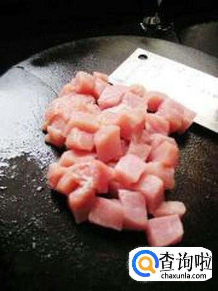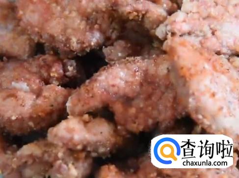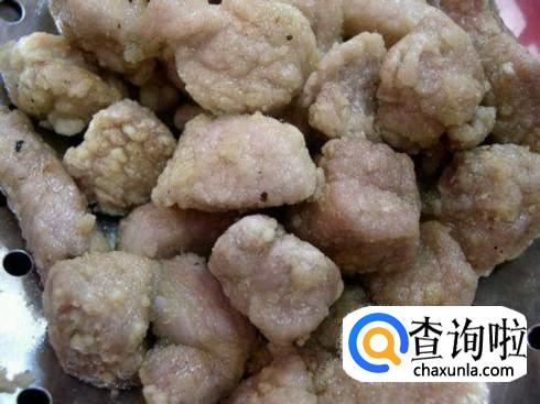然后往锅中加入更多的食用,待油加热至沸腾,倒入瘦肉块,炸3分钟。起锅备用。