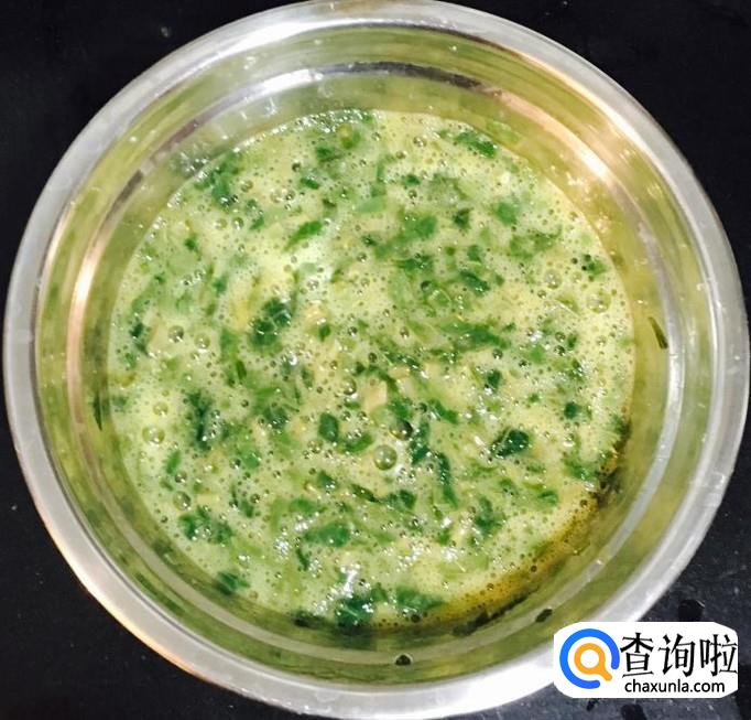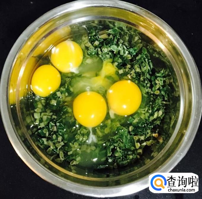 把切好的香椿碎放入容器中打入四个鸡蛋,加入适量的盐、蚝油、料酒,少许清水搅拌均匀