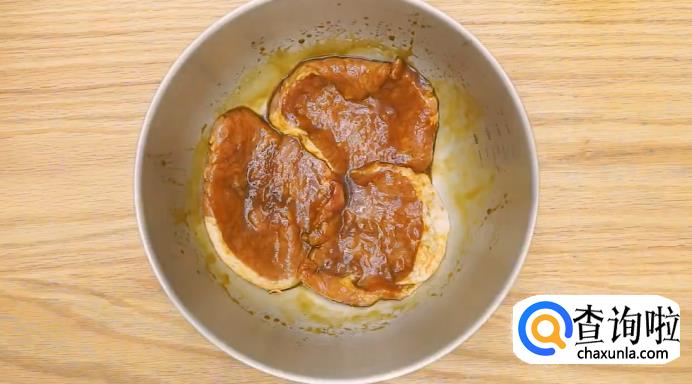 然后,把猪排切成薄片,用肉锤拍松。接着在猪排里加入腌肉汁,用手抓匀,盖起来腌制1个小时,这样的话,炸好之后就会非常入味。