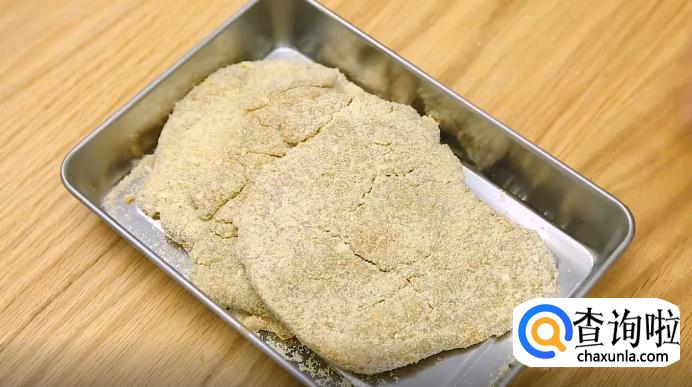 接下来,把鸡蛋打散,再把腌制好的猪排先放进蛋液里,然后裹上饼干粉,再放回蛋液里,再裹饼干粉,一共两次。
