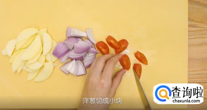 将土豆去皮,切成有厚度的小块,这样炒锅之后就不会变的软趴趴的。然后再把洋葱和小番茄切成小块,放在一旁待用。