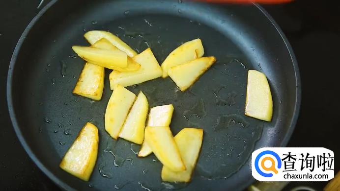 另起一口平底锅,烧热后加适量的油,把土豆放进去煎到焦黄,捞出来备用。再将黄油放进锅里,中小火加热到融化,放入洋葱炒软,再倒入之前调好的酱汁煮开,放入豌豆、番茄,翻炒1分钟左右。最后,加入之前煎好的土豆,拌炒均匀就可以了。