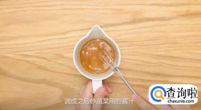 接着,把番茄酱1大勺、糖半大勺、生抽1小勺、鸡精半小勺、面粉半大勺和清水120ml搅拌均匀,调成之后炒蔬菜用的酱汁。