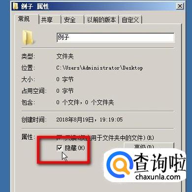 勾选“隐藏”后,再点确定。 这时,我们再回到电脑桌面上,“例子”这个文件夹即看不见了。
