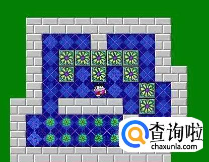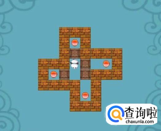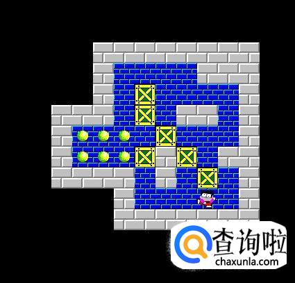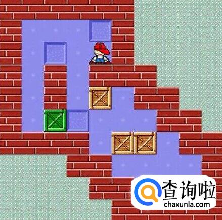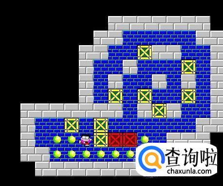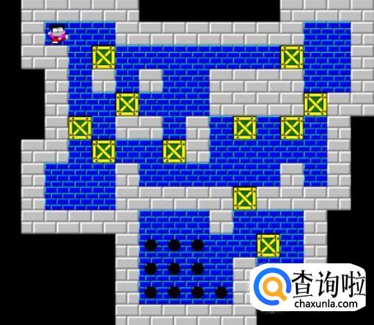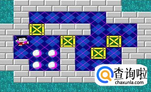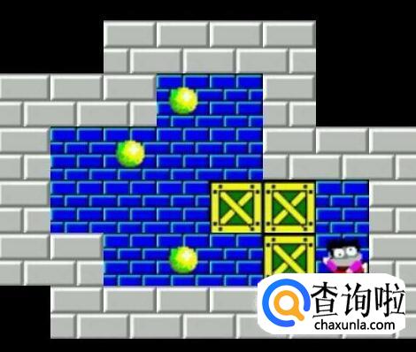 将挡在中间的箱子向下推两步,将靠右边的箱子向上顶一步,将最下面的箱子向左推一步,将原先推下来的箱子向顶回原来的位置,这时将挡在左边的箱子推至钱币的右下角,然后将中间挡路的箱子推向右上角,再将靠中间墙的箱子推至左下角,最后将余上的箱子推至最后一枚钱币。