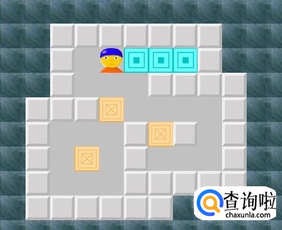 先将最右边的箱子推至最底,将纵列三个箱子中的中间箱子向右推两步入钱币,将三列中的中间箱子向上顶一步,然后再将其向下推至最底,将最上的箱子向右推两步,将最后箱子推入钱币完成任务。