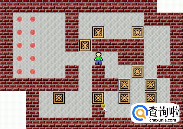 将挡路的箱子向下推一步,将挡路的第二个箱子向右推一步,工人向下走一步,然后将右手的箱子向右推一步,将已经在钱币中的箱子向上推至顶,将第二排右手边的第一个箱子向右推一步入钱币中,再将头顶的箱子上顶入钱币,将左手的箱子向右推两步进钱币,最后将余下的箱子推入最后一枚钱币。