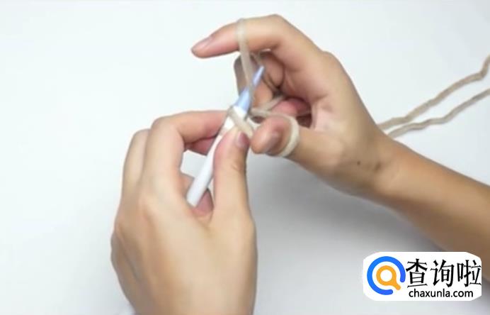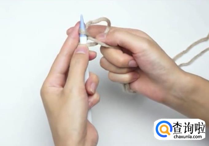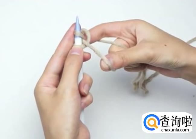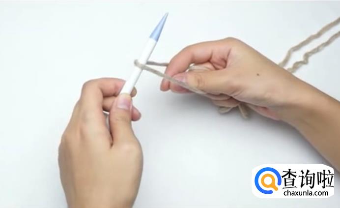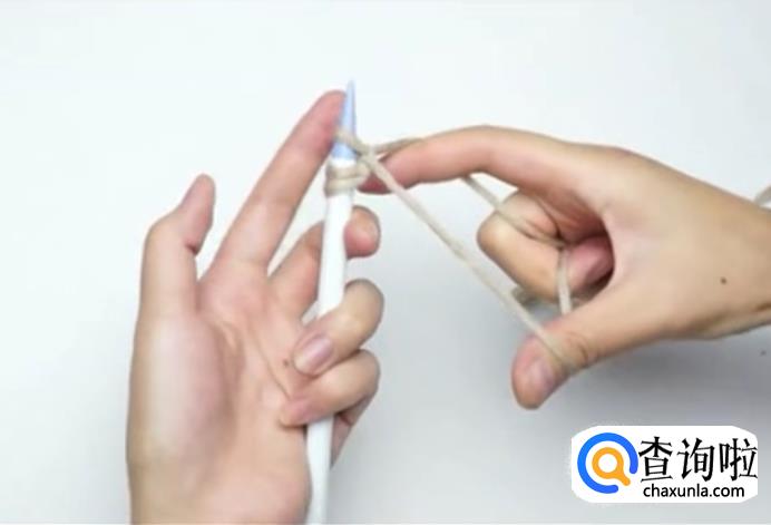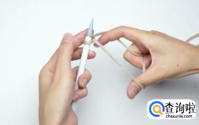 用毛线在棒针上绕一圈,这是第一针。左手固定住棒针上的线,然后勾住大拇指内侧的线,再勾住食指内侧的线