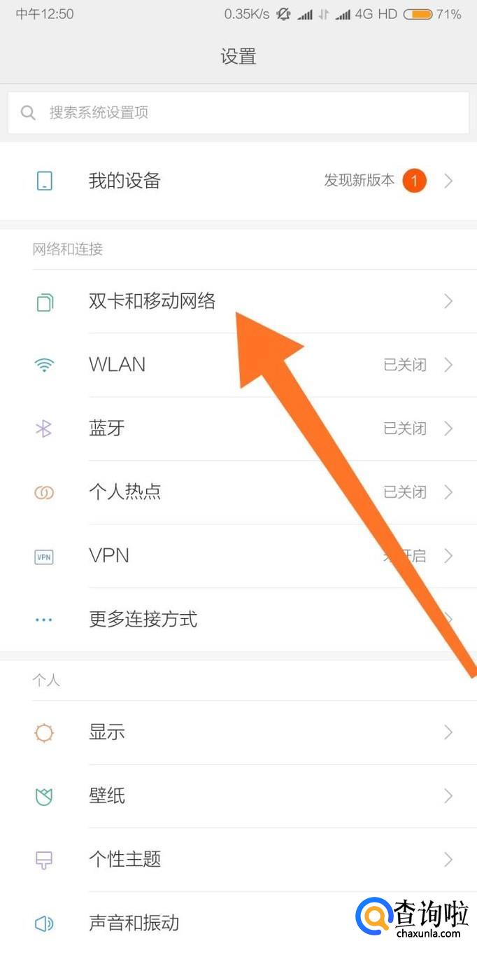 然后找到“双卡和移动网络”设置选项,点击进入。