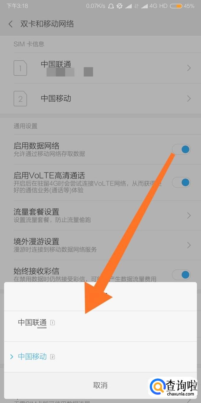 最后选择另一张手机卡后,手机移动数据网络就会切换到另一张手机的网络。