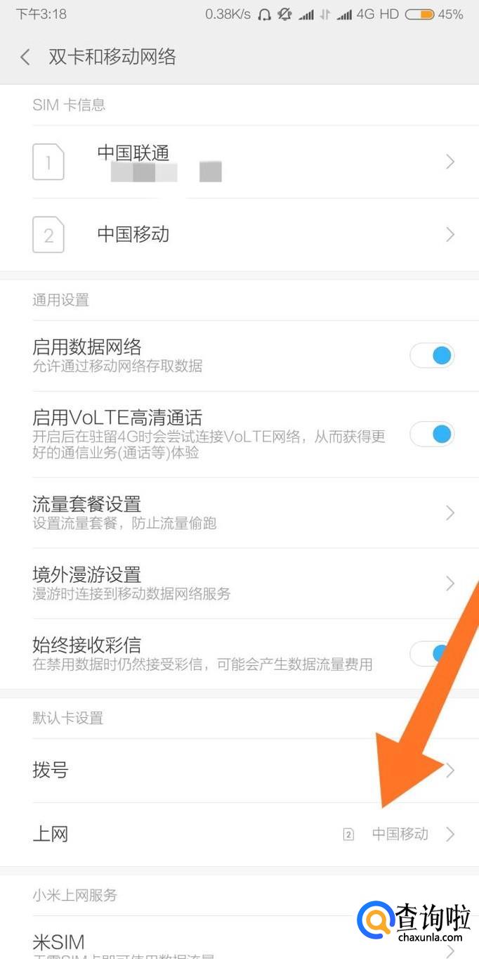 接着点击默认卡设置下方的“上网”卡设置选项。