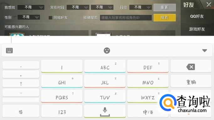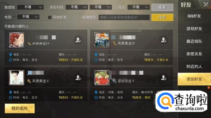 进入添加好友过后,可选择段位等各种所需信息进行大范围搜索,再选择相关游戏用户添加即可。
