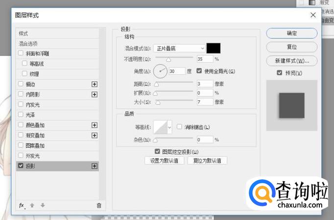 鼠标右键单击背景图层,选择混合选项,选择阴影,调节距离参数,调整到自己感觉合适位置即可