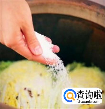 腌菜缸清洗干净,不允许有一滴油,撒上一层粗盐,摆上一层整颗的白菜,再上一层食盐,直到铺满为止。