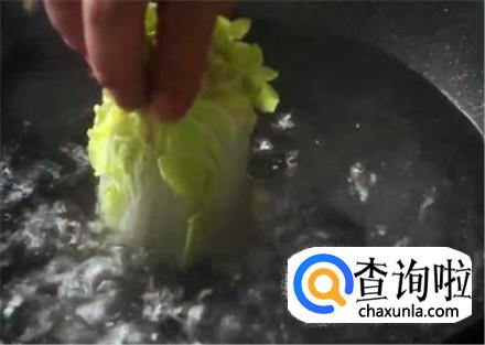 锅里烧开水,大白菜的根部,就是白菜帮子,直接竖着放进去热水里烫软,然后捞出来晾干。