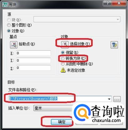 在写块面板中,如图所示,点击“选择对象”,然后用鼠标选中需要分割的图形,点击选中“转换为块”,设置文件名为“新块”,并保存在如下路径,点击确定。